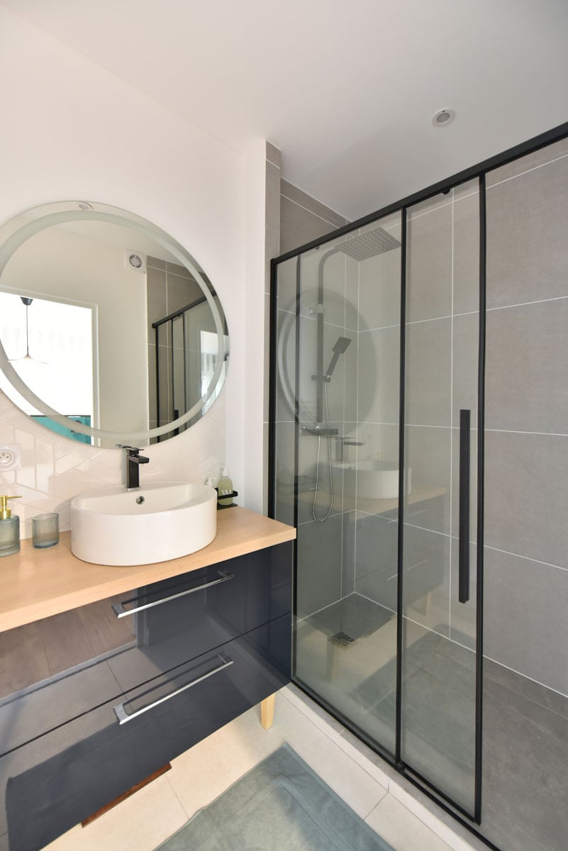 Pour cette maison de famille et de location, nous avons pris soin de chaque détail, comme ce listel doré au dessus de la faïence. Cela influence inconsciemment notre perception de la qualité du projet.